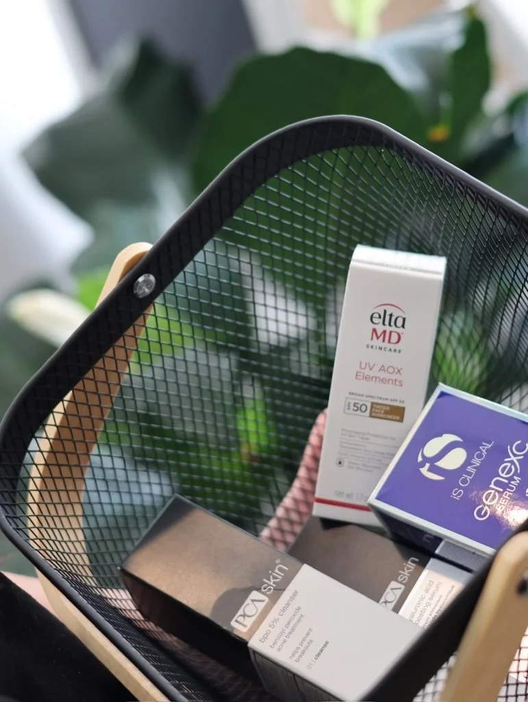 A black wire mesh basket holding skincare products, including EltaMD UV clear sunscreen, SkinCeuticals serum, and PCA Skin products, with green leafy plants in the background.